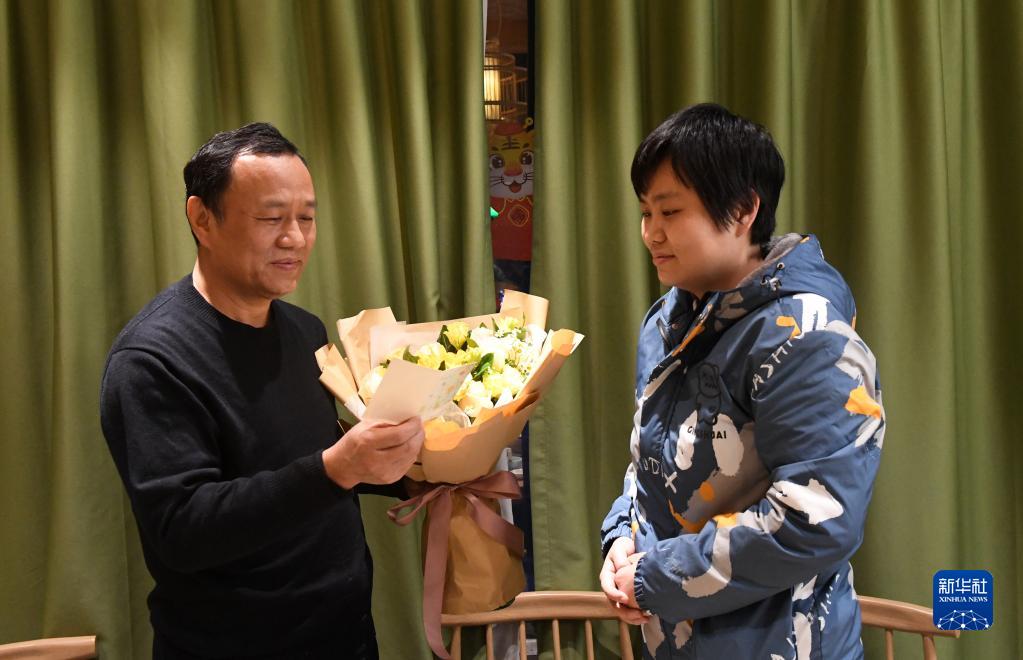 孙方平捧着孙艳琳从广州返回南宁后送的鲜花,看女儿在贺卡上写的祝福语(1月28日摄)。