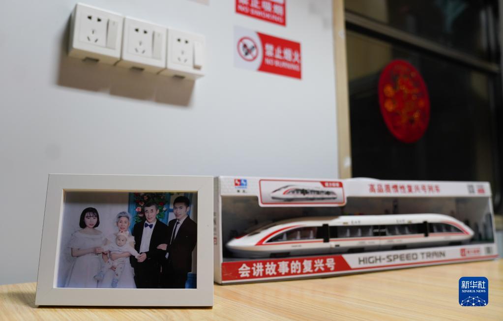 这是宿营车上放置的鹰潭工务机械段工作人员胡继德和家人的合影(1月27日摄)。旁边的高铁玩具是为孩子准备的新年礼物。由于临时接到上级的调度安排,他今年无法回家过年。