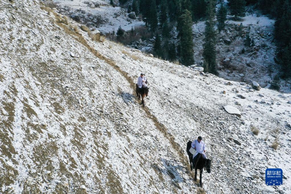 在新疆昭苏县的冬季牧场阿合牙孜沟,牧业医院的医生骑马在巡诊途中(1月25日摄,无人机照片)。