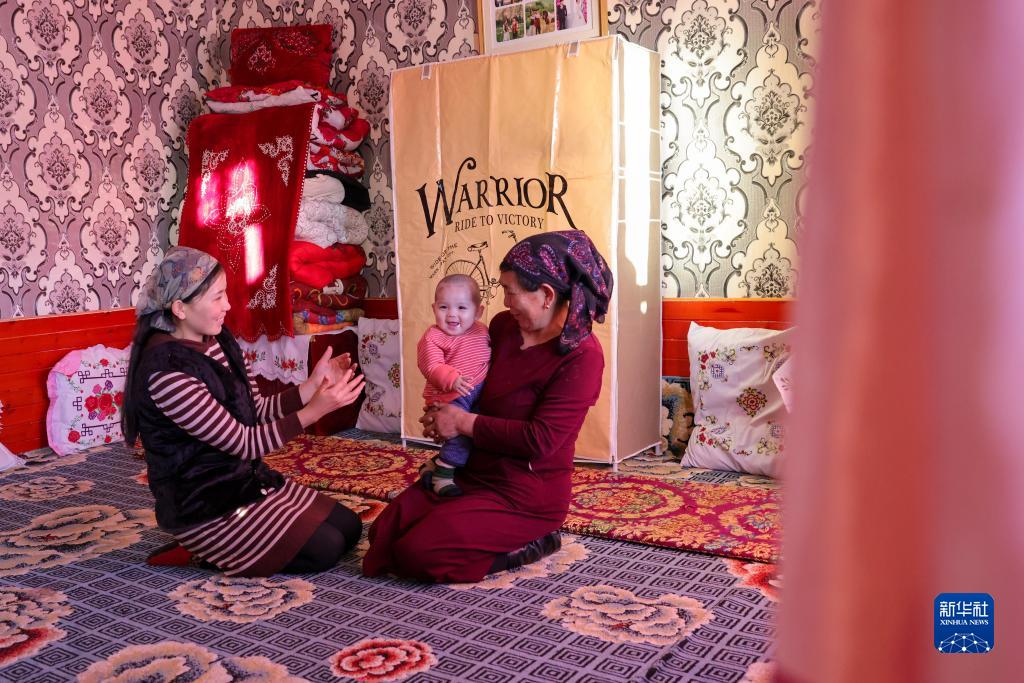 在新疆特克斯县喀拉达拉镇喀拉峻牧业村,定居的牧民在家中聊天(1月27日摄)。