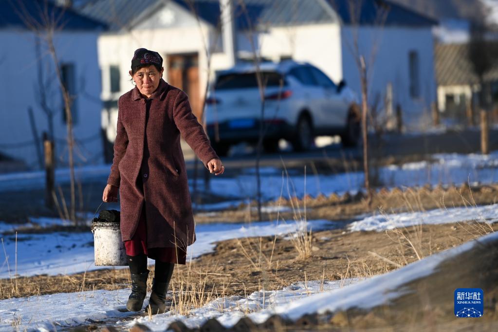 在新疆特克斯县喀拉达拉镇喀拉峻牧业村,定居的牧民拎着煤块准备回家烧火做饭(1月27日摄)。