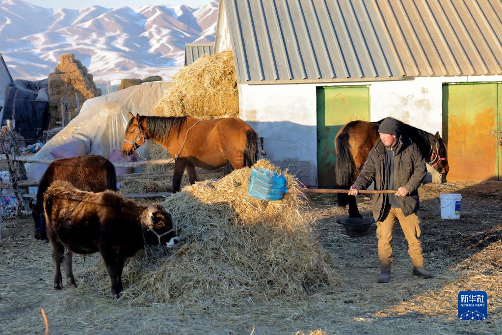 在新疆特克斯县喀拉达拉镇喀拉峻牧业村,定居的牧民在养殖区整理草料(1月27日摄)。