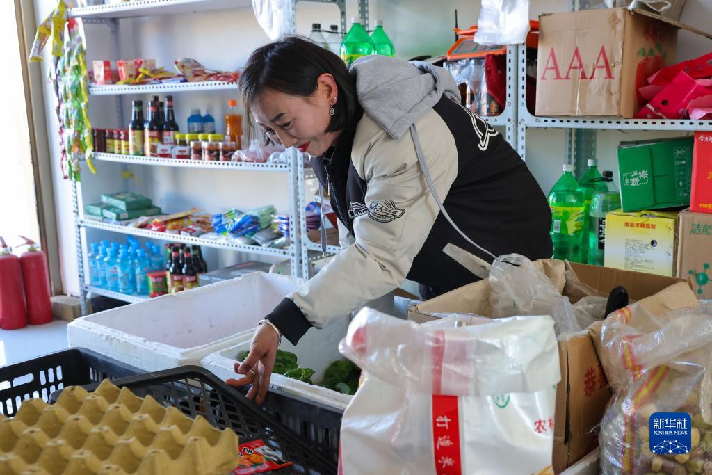 在新疆特克斯县喀拉达拉镇喀拉峻牧业村,定居的牧民在自家经营的小商店内整理货品(1月27日摄)。