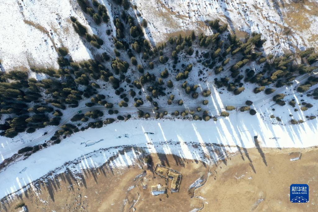 这是1月26日拍摄的新疆昭苏县的冬季牧场阿合牙孜沟景色(无人机照片)。