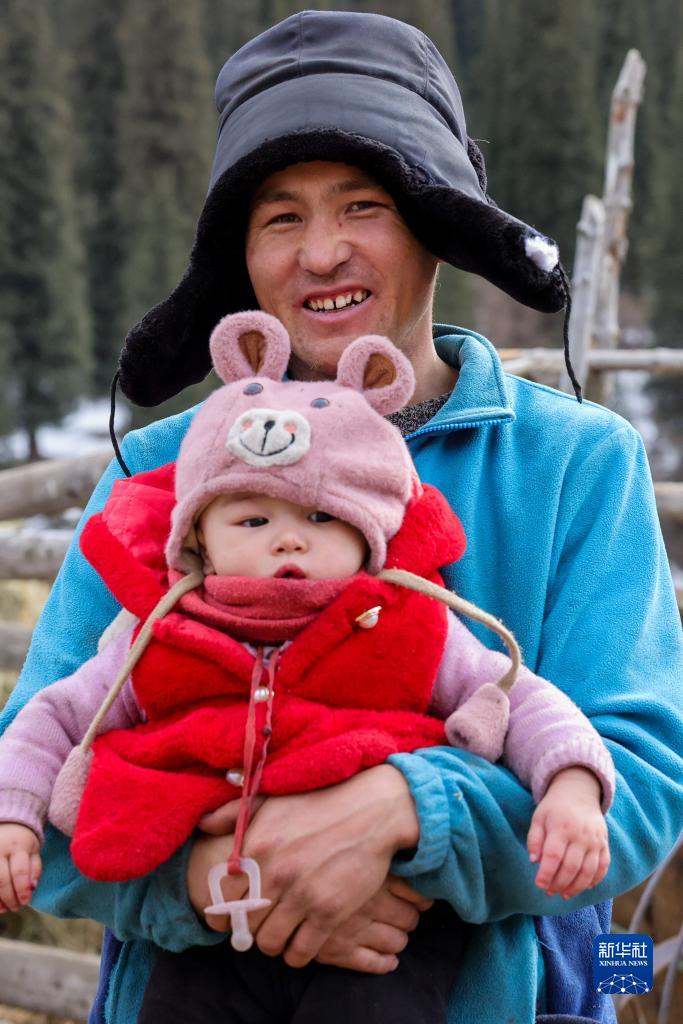 这是1月26日拍摄的生活在新疆昭苏县冬季牧场阿合牙孜沟的牧民和孩子。