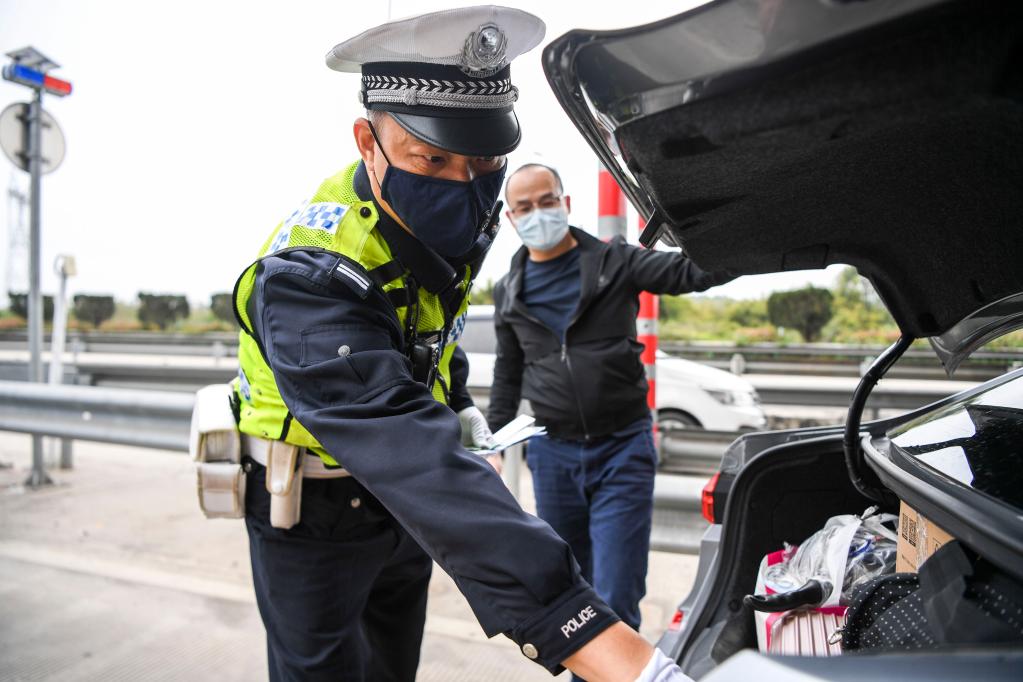 1月28日,广西梧州市公安局交警支队高速一大队民警陈启军对返乡人员的车辆进行安全检查。