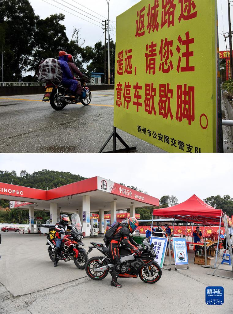 拼版照片:上图是在广西梧州市东出口一处春运服务站,返乡摩托骑手在结束休息后继续前行(2016年1月23日新华社记者黄孝邦摄)。