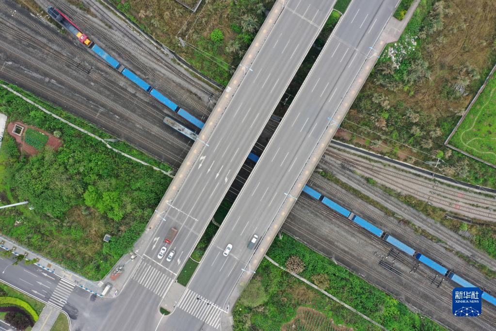 2021年3月19日,中欧班列(渝新欧)十周年纪念专列从重庆一座公路桥下穿过(无人机照片)。