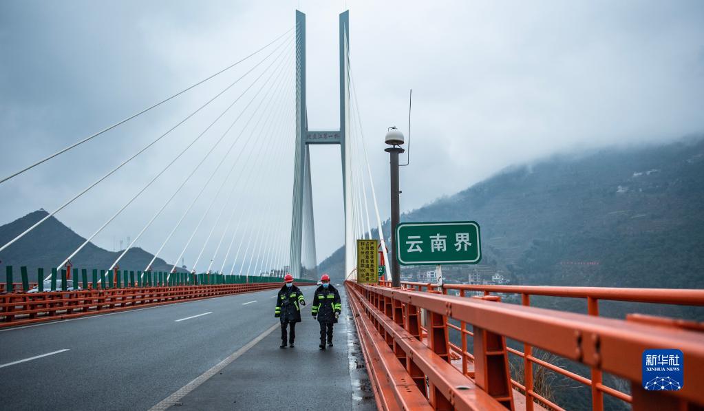 贵州高速集团水城营运中心俄脚桥隧站职工在桥面进行巡查(1月29日摄)。