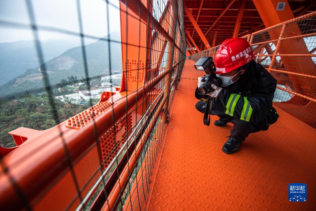 贵州高速集团水城营运中心俄脚桥隧站职工在桥体内部对受损点拍照留档(1月29日摄)。