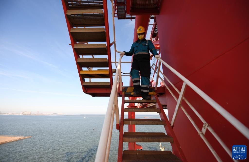 在天津港南疆港区26泊位,卸船机司机许宝利从卸船机顶部平台走楼梯去往驾驶舱(1月28日摄)。