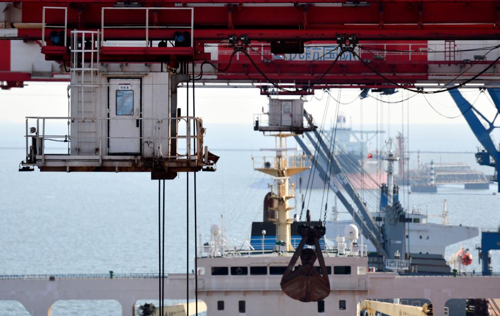 在天津港南疆港区26泊位,卸船机在进行卸货作业(1月28日摄)。