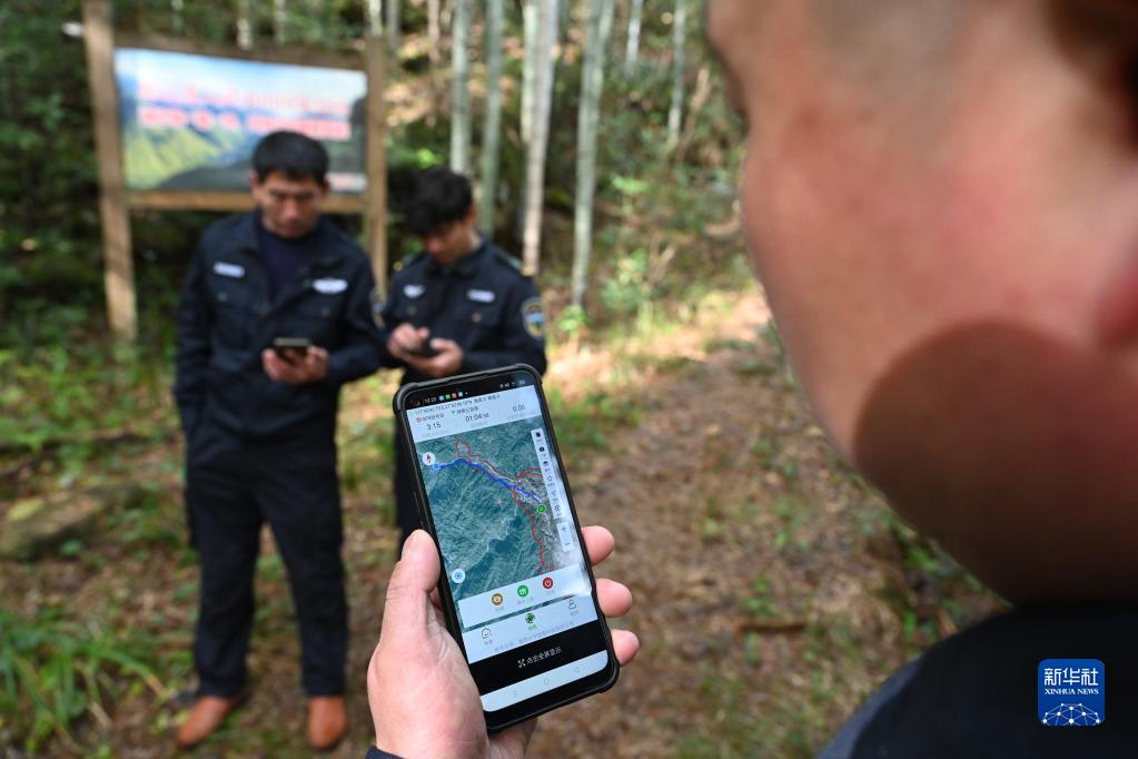 1月19日,武夷山国家公园护林员在手机上使用“巡山助手”APP查看地理位置信息。