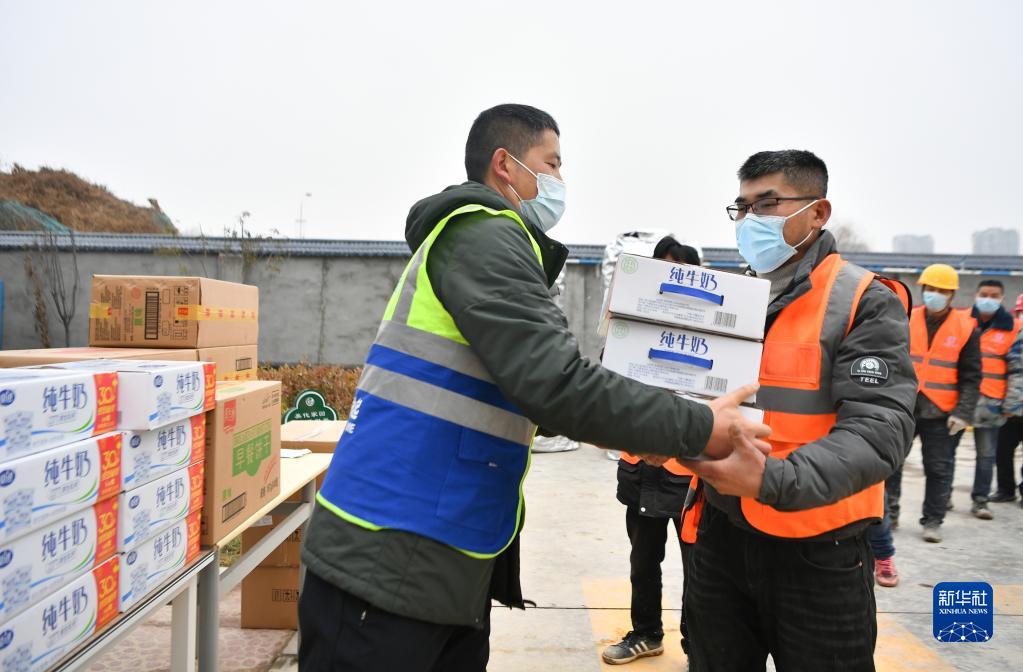 1月30日,在西安市第一实验学校建设项目工地,管理人员(左)向留守工地的工人发放生活物资。