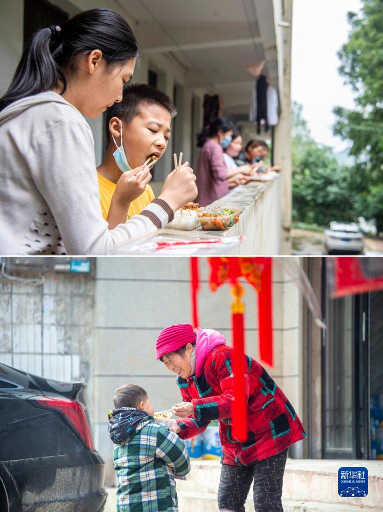 拼版照片:上图为2021年8月14日,柳林镇中心学校集中安置点的小朋友在吃午饭;下图为2022年1月29日,柳林镇居民在柳林镇主街道上吃早餐。