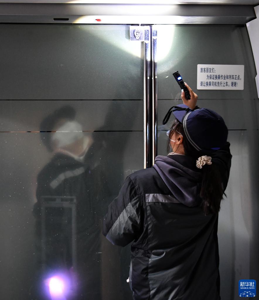 女子检修队的检修员在查看车厢自动门(1月30日摄)。新华社记者 陈振海 摄