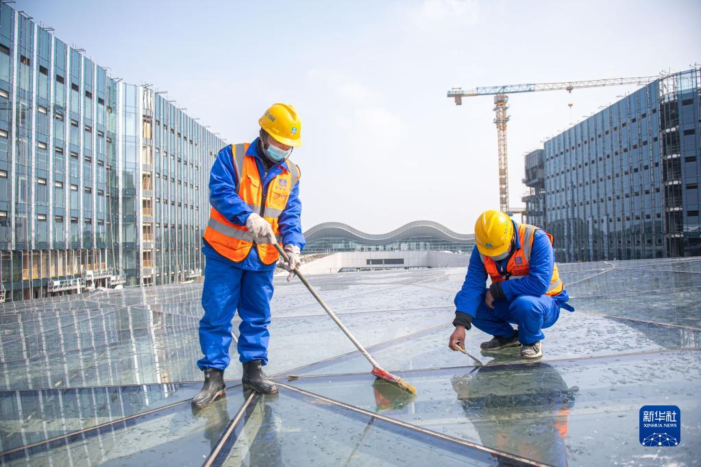 1月31日,工人们在杭州萧山国际机场三期交通中心项目工程现场清洗玻璃顶棚。