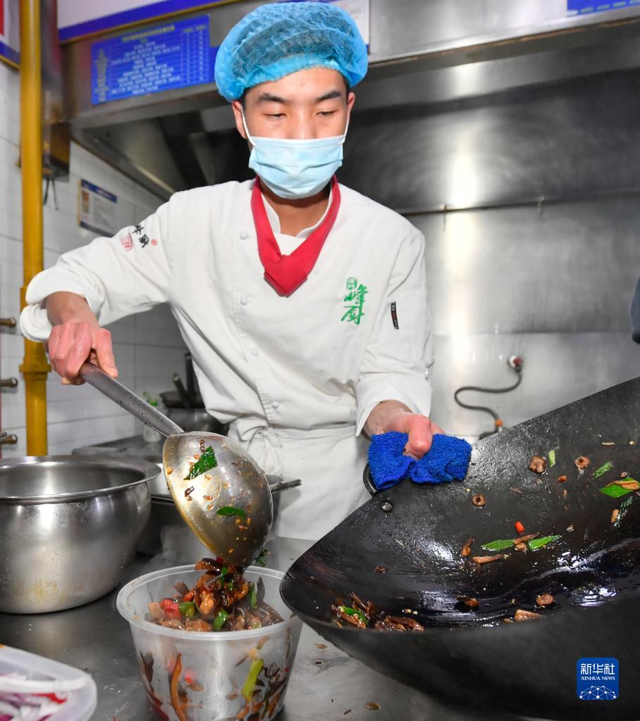 1月31日,在天津市南开区某餐饮企业厨房,厨师将炒制好的菜肴装入外带食品盒。