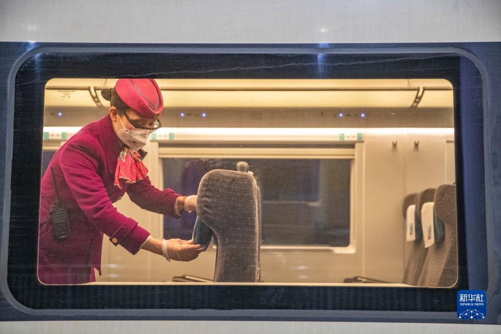 1月30日,在万州北站,罗敏在列车车厢内整理座位。