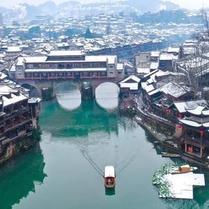 当日是农历除夕,湖南省湘西土家族苗族自治州凤凰县迎来降雪天气。凤凰古城银装素裹,别有一番韵味。