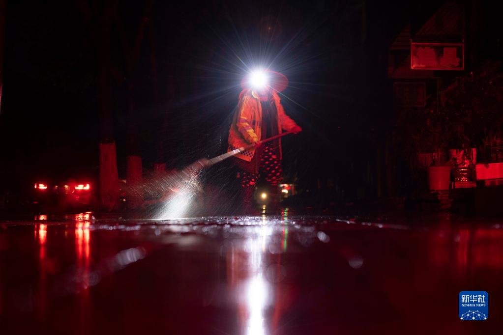 1月31日,在湖南省永州市道县爱莲北路,环卫工人在清扫街道。