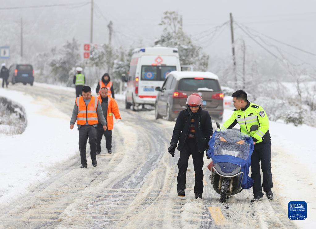 1月31日,在贵州省丹寨县野鸭塘积雪路段,执勤交警在帮助群众推摩托车。