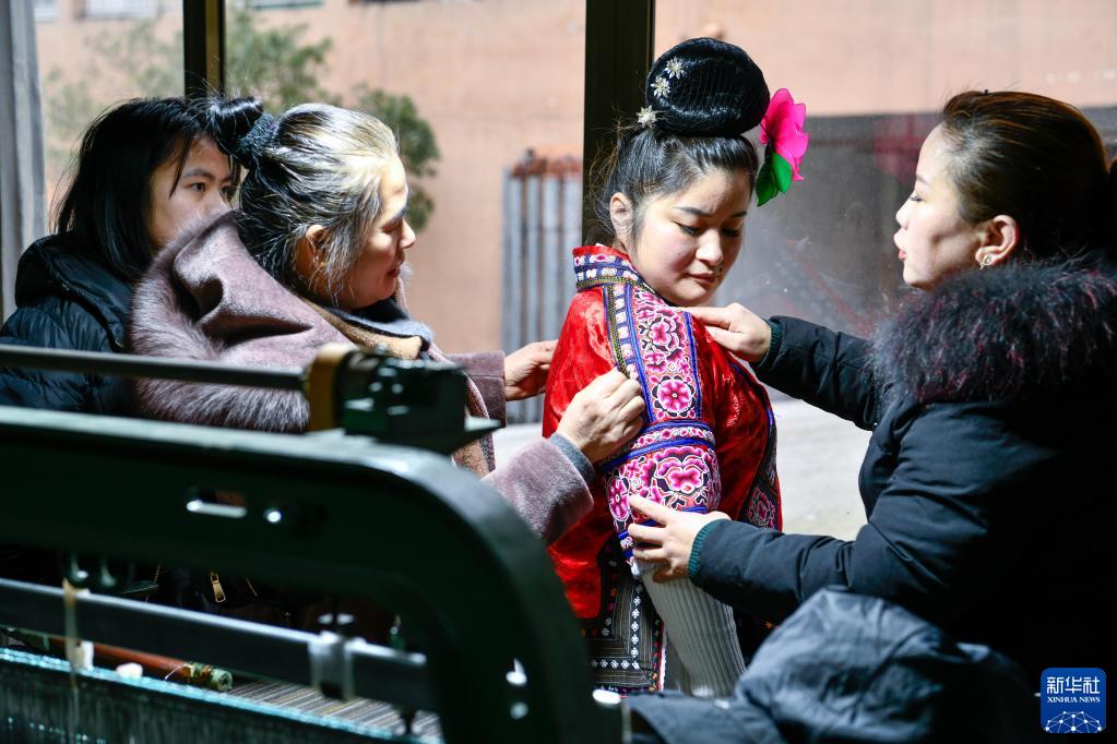 1月30日,杨美(右二)和员工(右一)在制衣厂里向顾客介绍自己绣制的民族服饰细节。新华社记者 杨文斌 摄