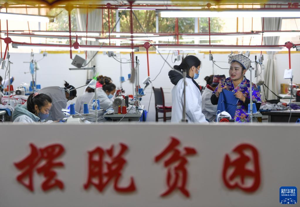 杨美(右一)和制衣厂工人交流(2020年10月18日摄)。新华社发(蔡兴文摄)