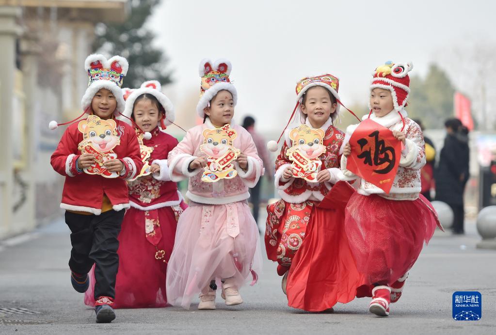 1月18日,在安徽省合肥市源水家园小区,头戴虎头帽的小朋友们手持“福”字和卡通吉祥物。
