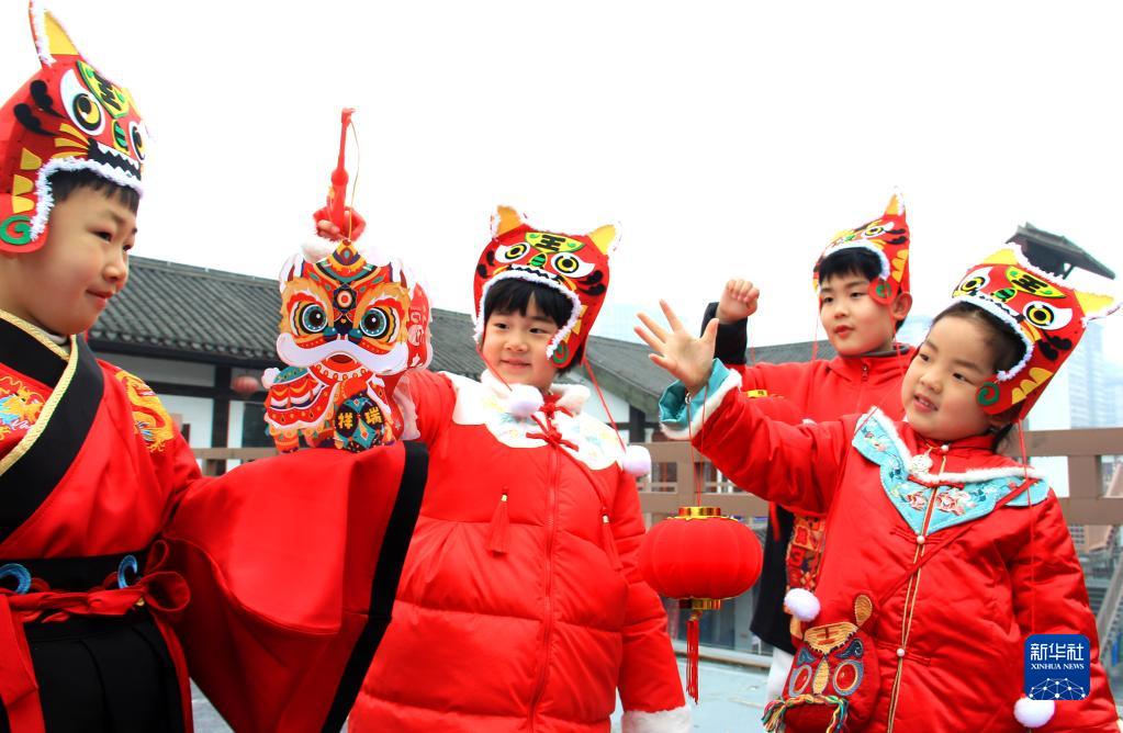 1月24日,在安徽省淮北市图书馆流动图书服务点隋唐运河古镇相山书院,孩子们头戴虎头帽,手持红灯笼,迎接春节到来。