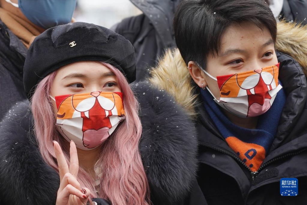 1月22日,游客戴着老虎元素的口罩在北京环球度假区拍照留念。