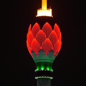 当日,斯里兰卡科伦坡地标建筑莲花电视塔点亮“中国红”,庆祝中国农历新年的到来。