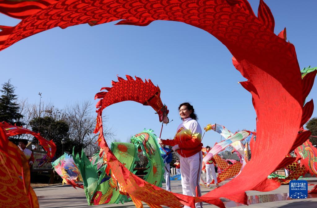 2月1日,在山东省枣庄市市中区,居民在公园内舞彩龙。