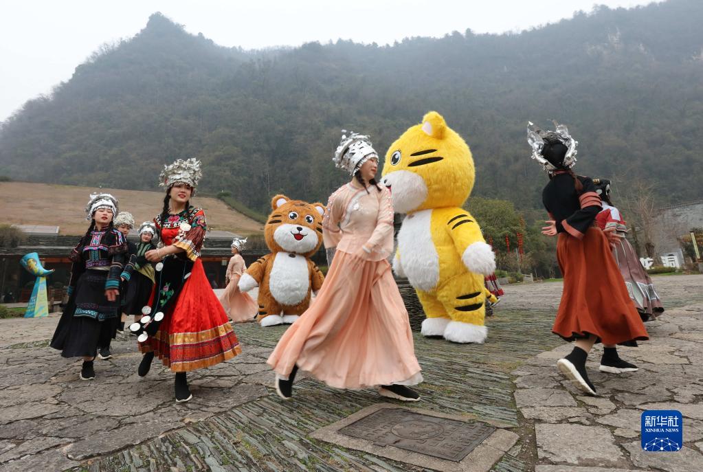 2月1日,湖南省张家界市武陵源区黄龙洞景区工作人员跳起欢快的摆手舞。