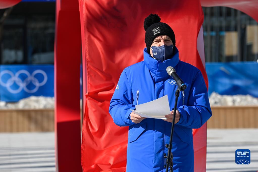 2月1日上午,国际奥委会主席巴赫在休战壁画前讲话。