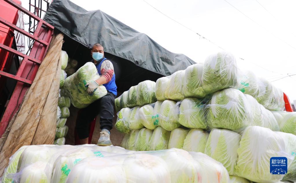 2月2日,在上海江桥蔬菜批发市场,搬运工从卡车上搬卸白菜。