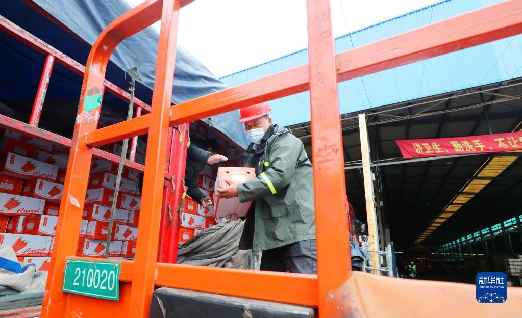 2月2日,在上海江桥蔬菜批发市场,搬运工从卡车上搬卸胡萝卜。