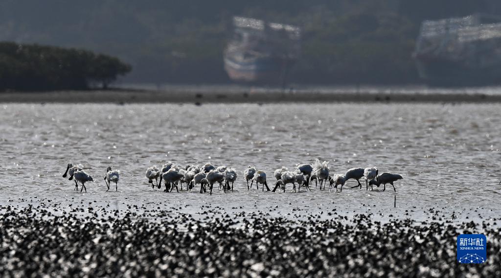 在海南新盈红树林国家湿地公园,黑脸琵鹭在滩涂上觅食(1月27日摄)。