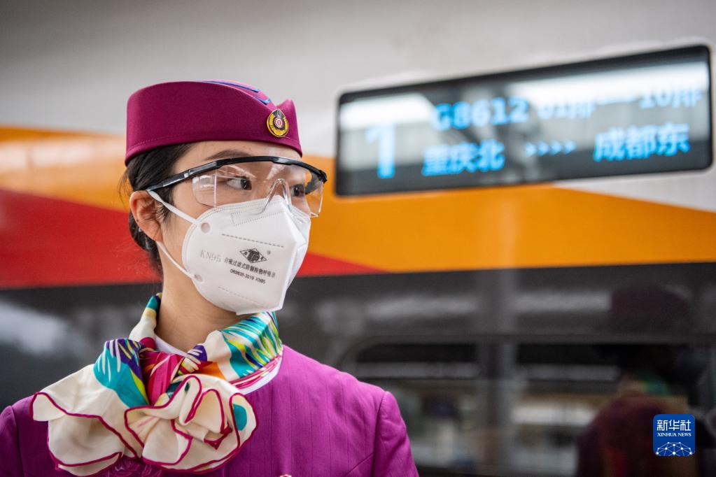 2月2日,在重庆北站,林梦凡在智能复兴号“共青团号”列车发车前做准备工作。