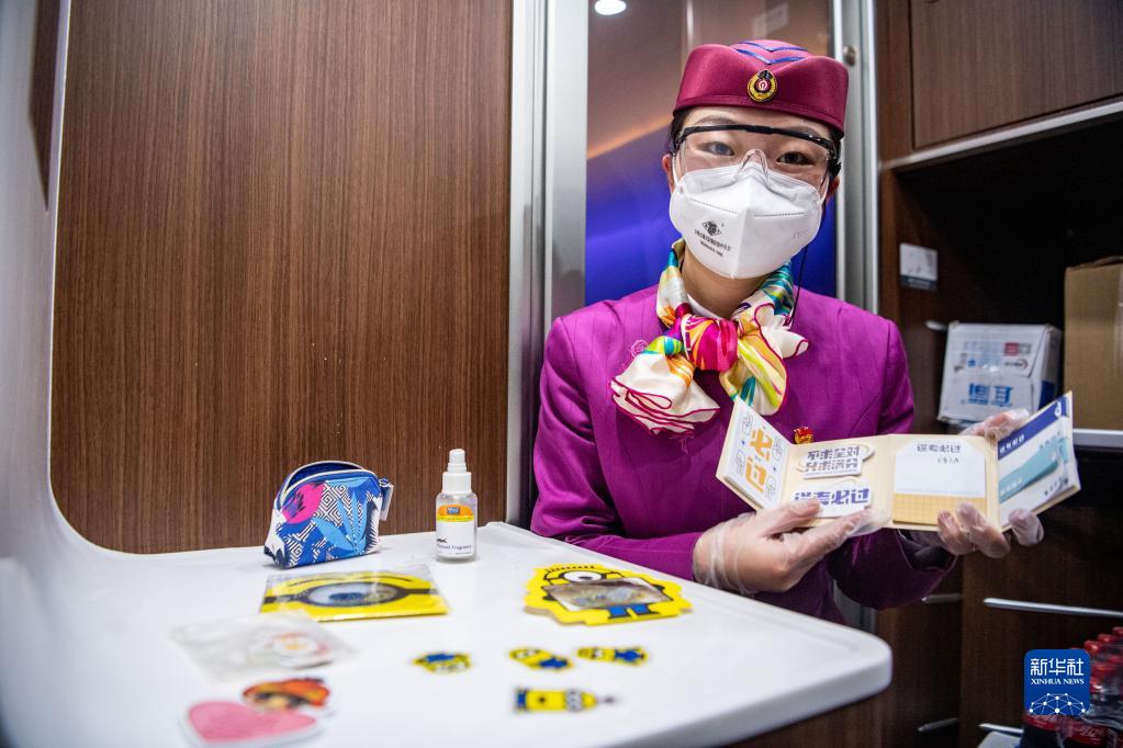 林梦凡在成渝高铁智能复兴号“共青团号”列车上展示““哆啦A梦口袋”里的小物件(1月27日摄)。