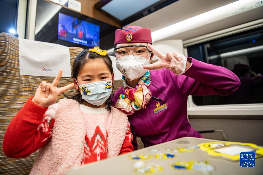 林梦凡(右)在成渝高铁智能复兴号“共青团号”列车上和小朋友合影(1月27日摄)。