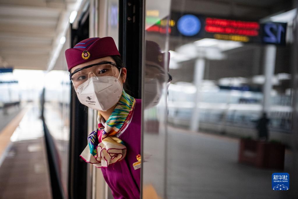 2月2日,在重庆北站,林梦凡在智能复兴号“共青团号”列车发车前做准备工作。