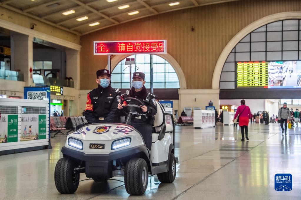 2月2日,武汉铁路民警在汉口站候车厅值班巡逻。