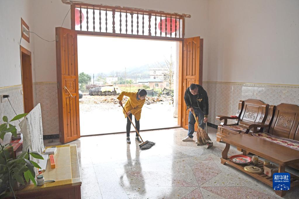 周龙富(右)和妻子李桂荣在家里打扫卫生(1月29日摄)。