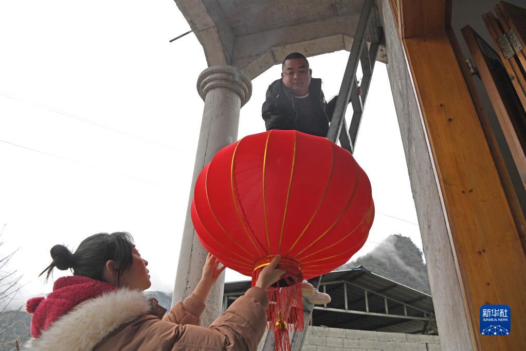 周龙富和女儿在家门口挂灯笼(1月29日摄)。