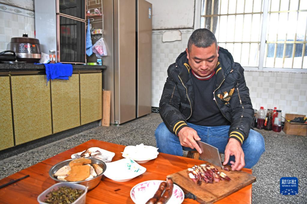 周龙富在家里切腊肉(1月29日摄)。