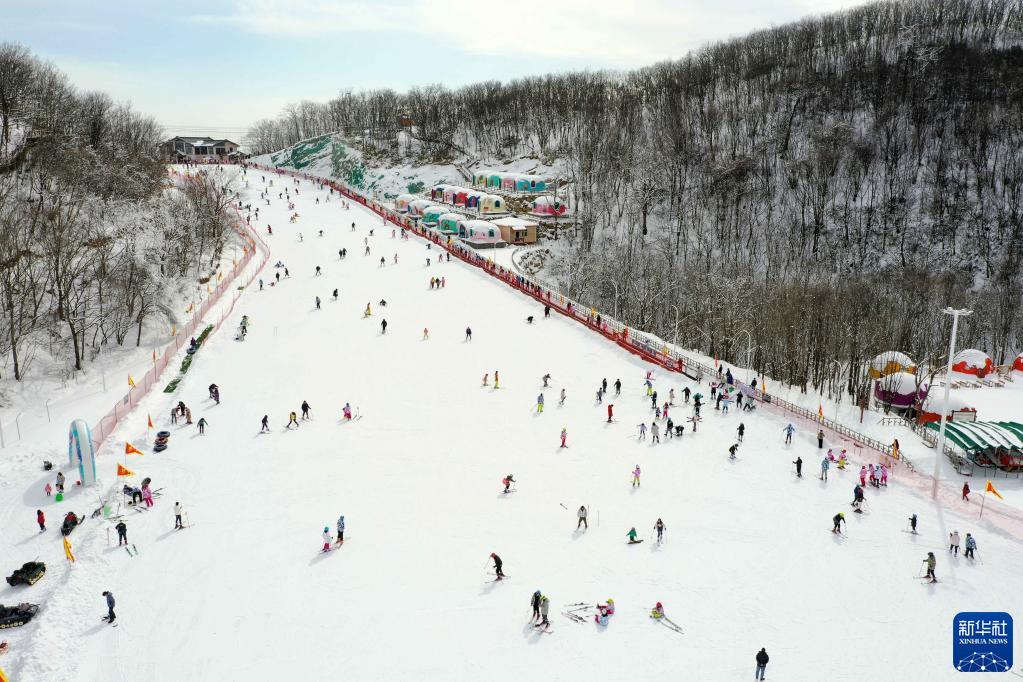 2月3日,游客在湖北省襄阳市保康县一家滑雪场滑雪(无人机照片)。