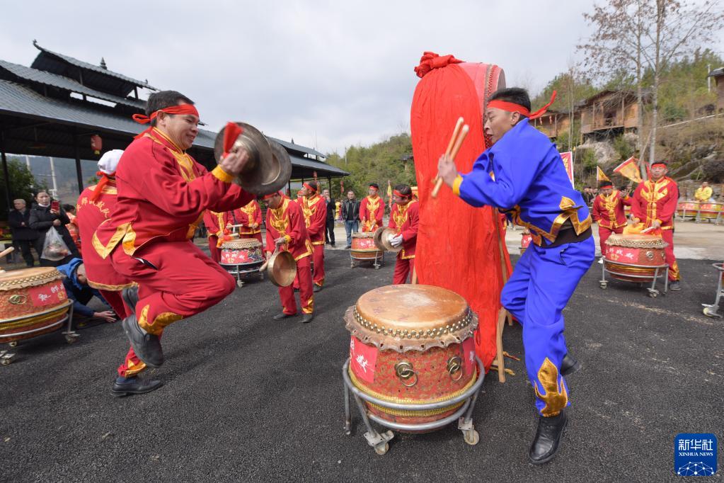 2月3日,在贵州省岑巩县大有镇一生态旅游度假区,民间艺人在表演“思州战鼓”。