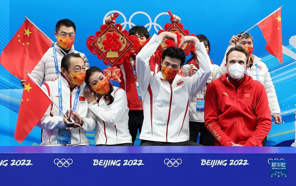 2月4日,中国选手王诗玥(前左二)/柳鑫宇(前右二)在冰舞韵律舞比赛后等待分数。