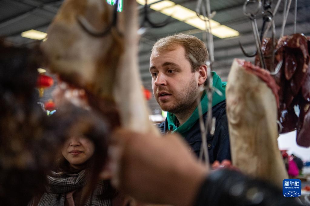 马丁在何埂镇集市上和商贩讨价还价(1月27日摄)。